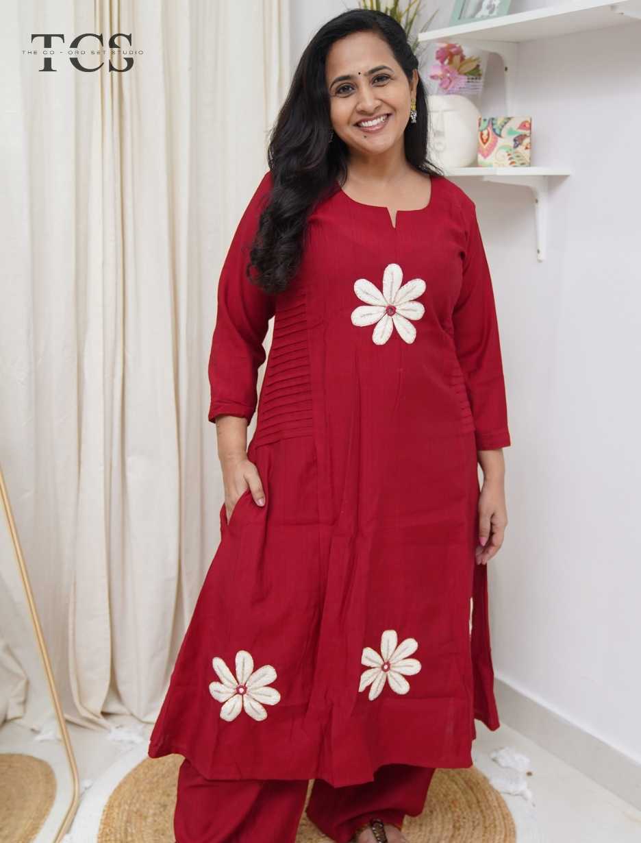 The Azure Bloom Pleated Kurti Palazzo Set is thoughtfully designed to blend comfort with refined style. Crafted from soft and breathable viscose fabric, this set features elegant thread embroidery on the kurti, adding a subtle handcrafted charm to your everyday ethnic wardrobe. The kurti is highlighted with stylish side pleats on both sides, creating a graceful fall and added movement that enhances the overall silhouette.