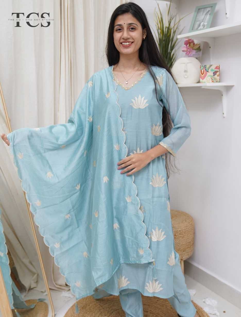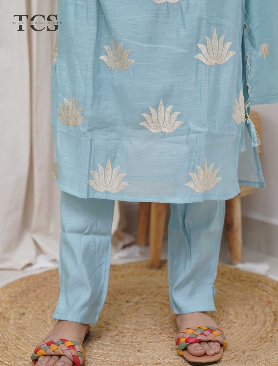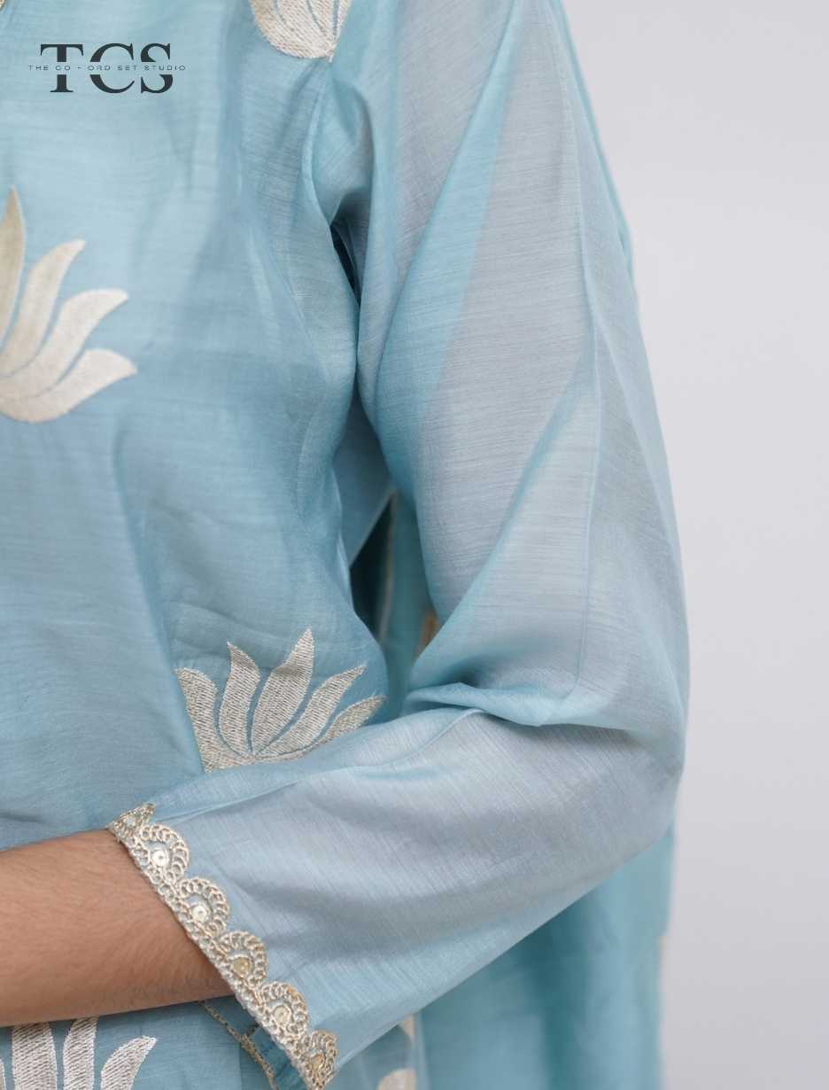 The Azure Lotus Mul Chanderi Kurti Pant Set with Dupatta is a graceful ethnic ensemble crafted for refined everyday elegance and festive comfort. Made from lightweight and breathable mul chanderi fabric, the kurti and pant offer a smooth drape with an airy feel, making this set perfect for day functions, poojas, and elegant gatherings.