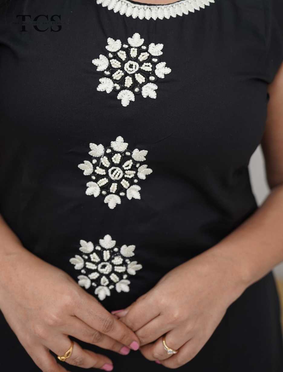 The top features intricate thread embroidery enhanced with delicate pearl detailing placed