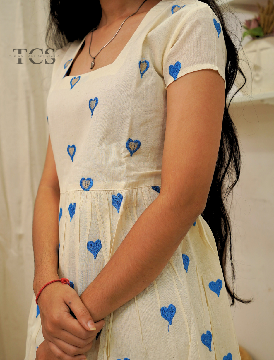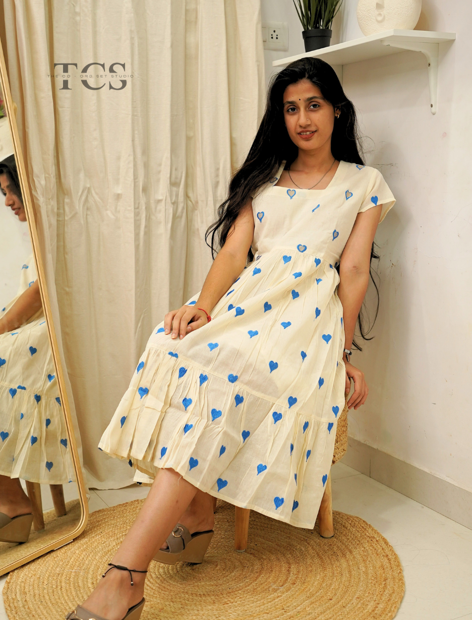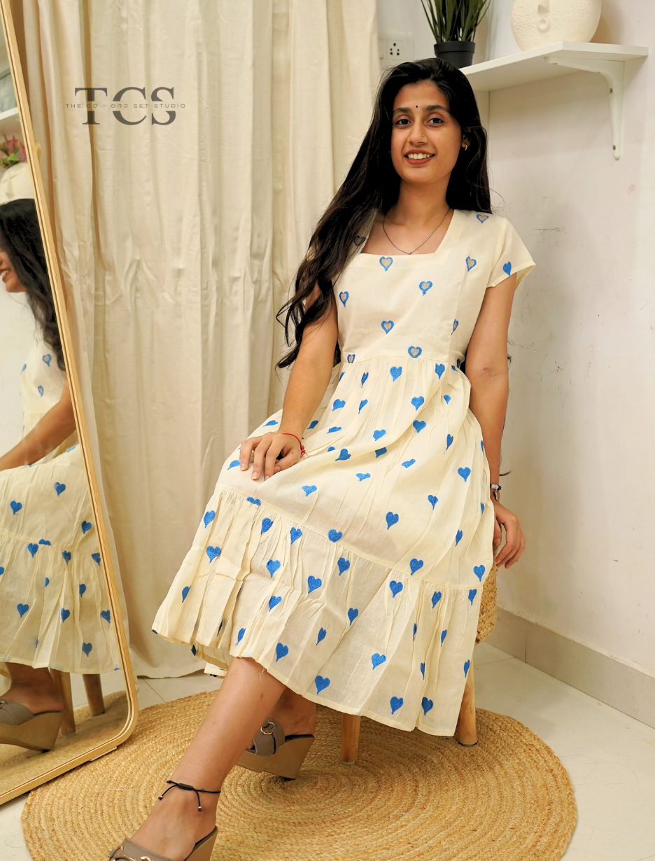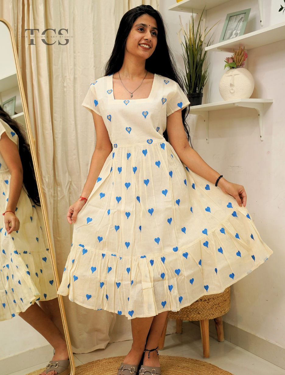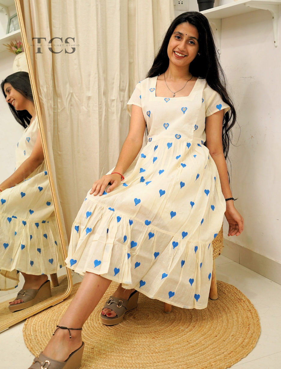 The Blue Heart Whimsy Frock brings a fresh, spirited feel to your wardrobe. Set on soft off-white cotton, the frock is sprinkled with playful blue heart prints for a look that’s both cheerful and inviting. A gently gathered waist, flowy tiered hem, and flattering square neckline combine comfort with standout style—perfect for expressing your playful side on any day.