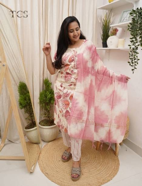 Step into effortless elegance with this blush-toned floral cotton kurti set, crafted for women who love soothing colours and comfortable everyday wear. The kurti features a beautiful mix of pink and peach floral motifs on a soft cream base, creating a gentle and feminine look. Paired with printed straight-fit pants and a soft tie-dye dupatta in matching pink tones, this set brings together charm, comfort, and versatility—perfect for casual gatherings, brunches, or graceful daily wear.