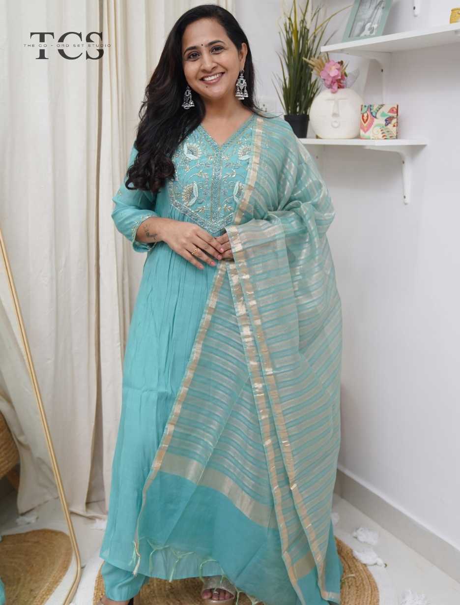 with a refined festive appeal. The kurti features a beautifully embroidered yoke enhanced with