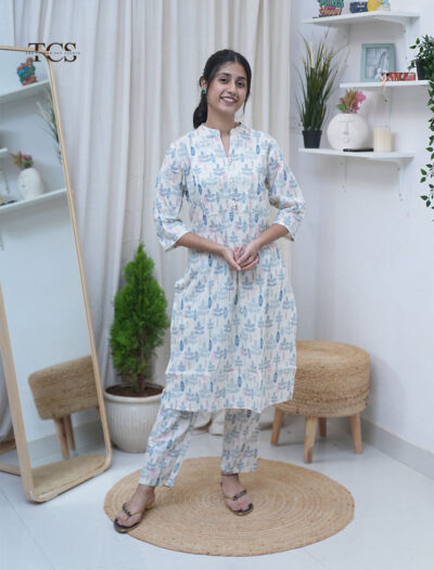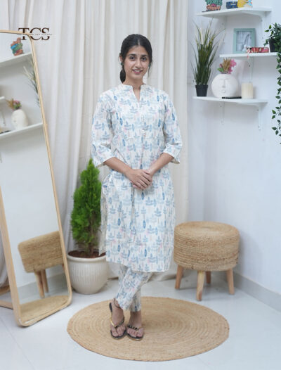 The kurta comes without lining, keeping it lightweight and easy to wear. It is paired with a matching cotton palazzo pant featuring a fully elasticated waistband for all-day ease. The look is completed with a soft chiffon Shibori dupatta that adds a graceful flow and artisanal touch to the ensemble.