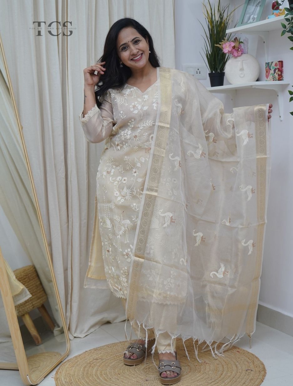 The Shimmer Kota Kurti Set is designed for refined elegance with a touch of festive charm. Crafted in lightweight shimmer Kota fabric, the kurti and dupatta feature delicate woven motifs that add a soft glow without overpowering the look. The airy texture of Kota fabric ensures breathability, making it perfect for long hours of wear.
