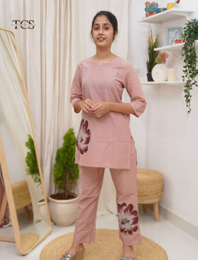 The kurti comes with lining for added comfort and structure, while the santoon bottom is tailored with an elasticated belt for ease and includes functional pockets for everyday convenience. Paired with a beautifully coordinated shimmer Kota dupatta, this set is ideal for festive gatherings, poojas, or elegant daytime occasions.