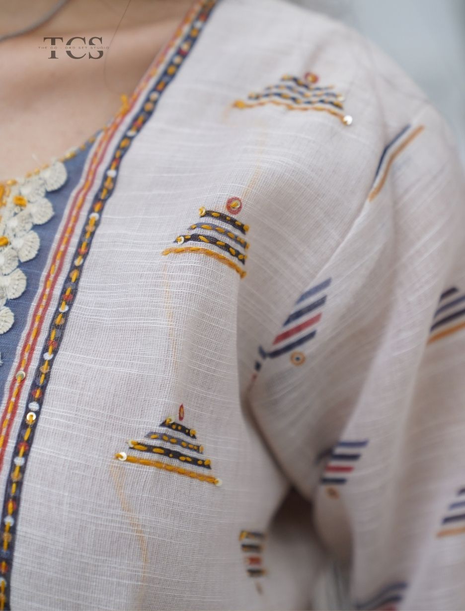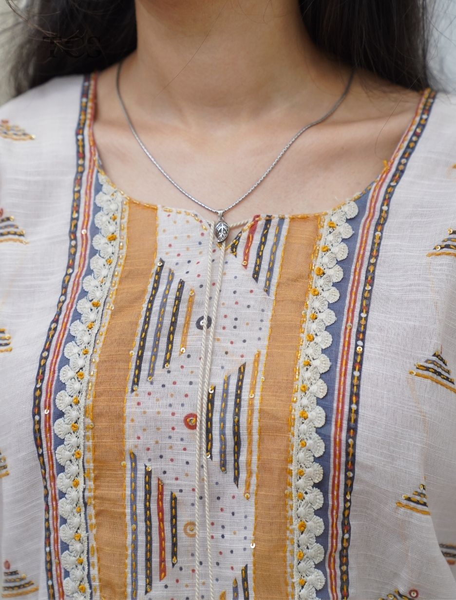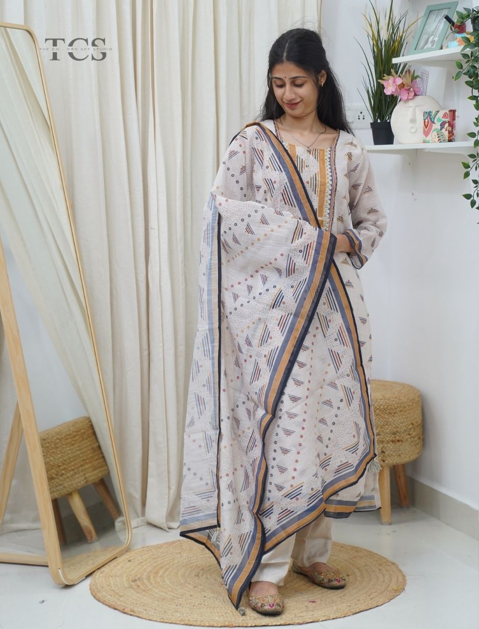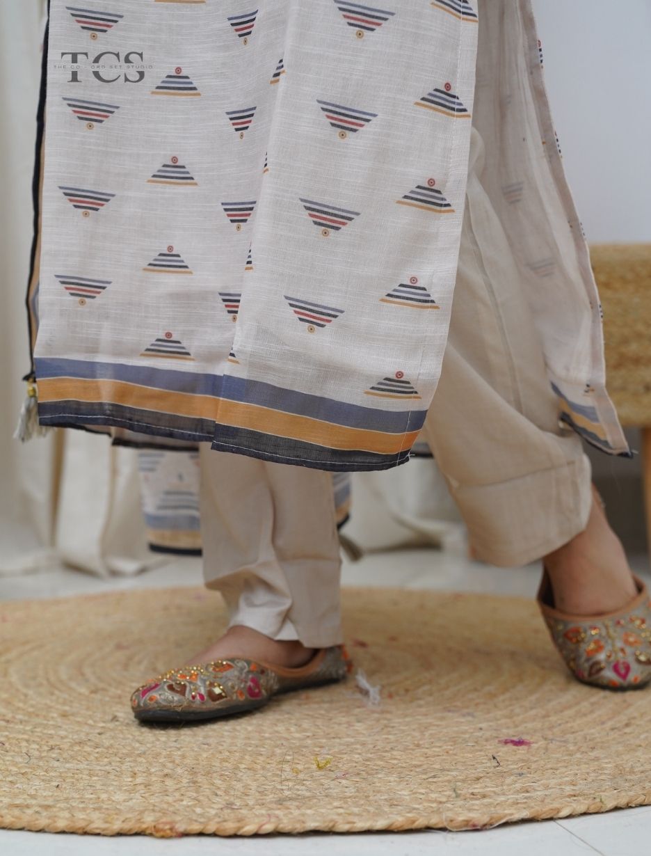 Ivory Printed Linen Kurti Set with Dupatta