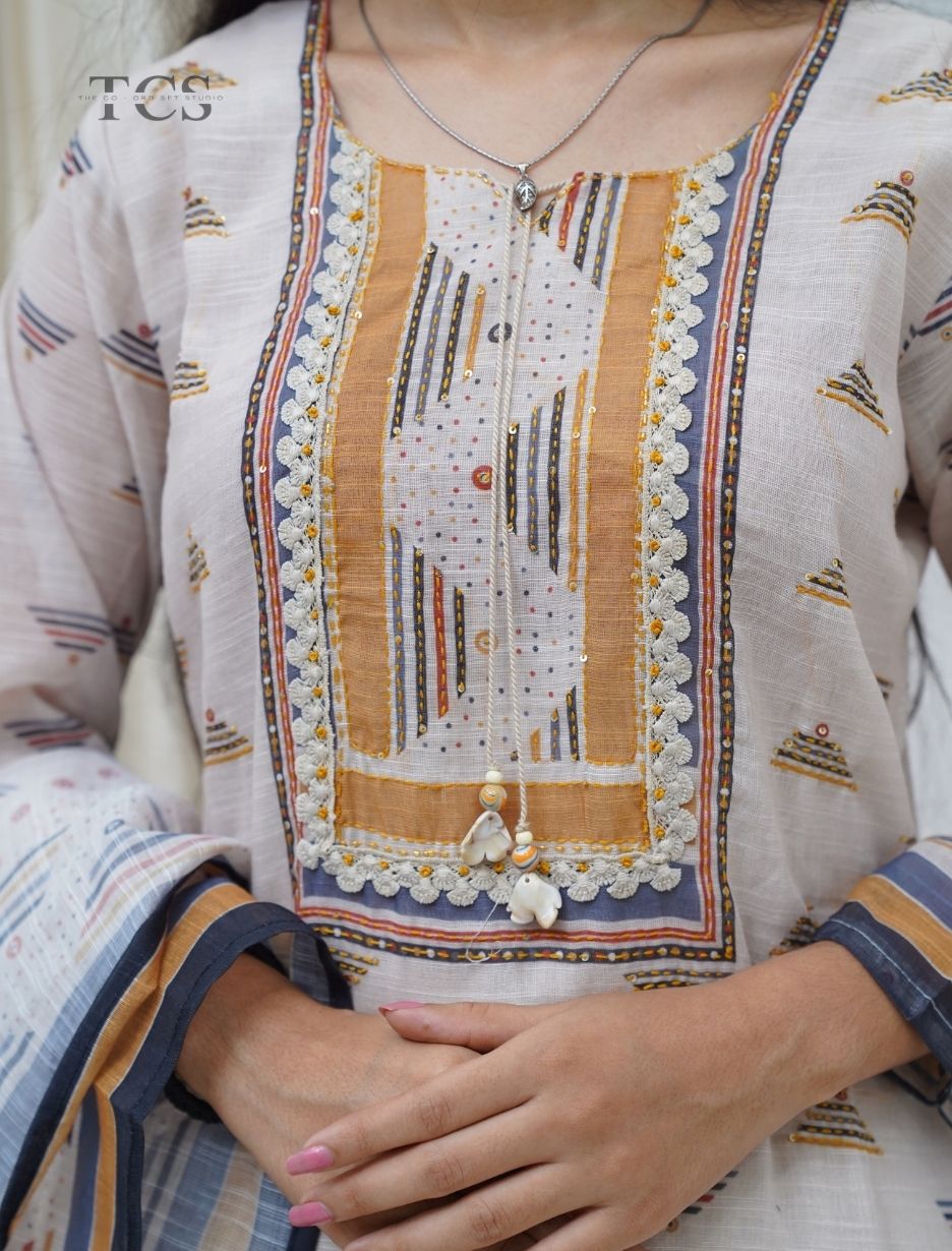 ⁠  ⁠Beige Multicolor Embroidered Kota Kurta Set with Dupatta