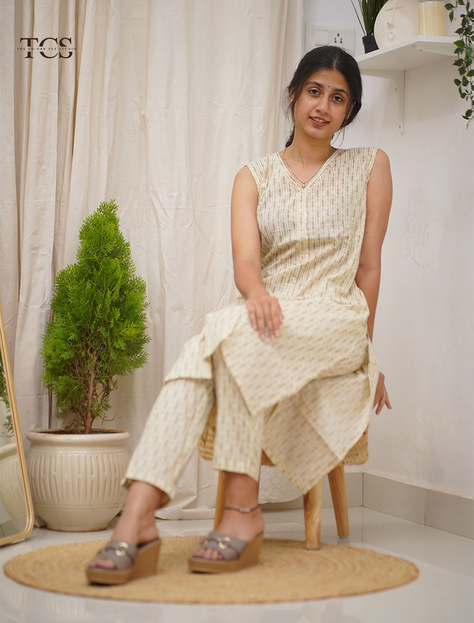 Keep it effortlessly stylish with this ivory Sleeveless Kurti set featuring subtle striped prints. Designed for modern simplicity, this lightweight outfit is perfect for daily wear, casual outings, or a relaxed day at home, offering both comfort and elegance.