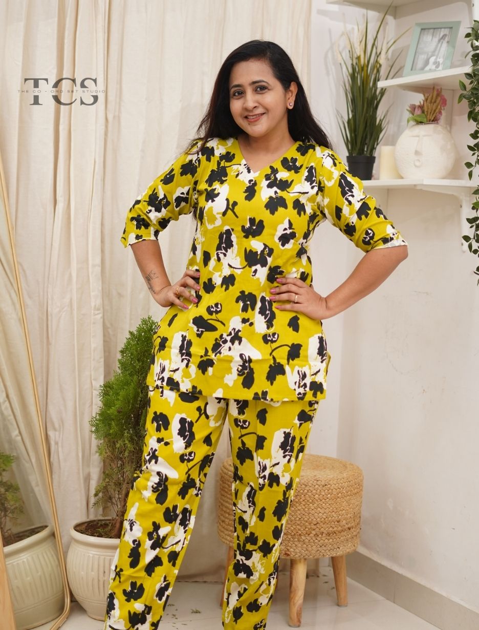 Step into vibrant style with this lively lime-yellow co-ord set adorned with chic abstract floral motifs. Designed for women who love standout prints without compromising on comfort, this set brings together ease, elegance, and everyday charm. Perfect for casual days, coffee meet-ups, or relaxed workwear.