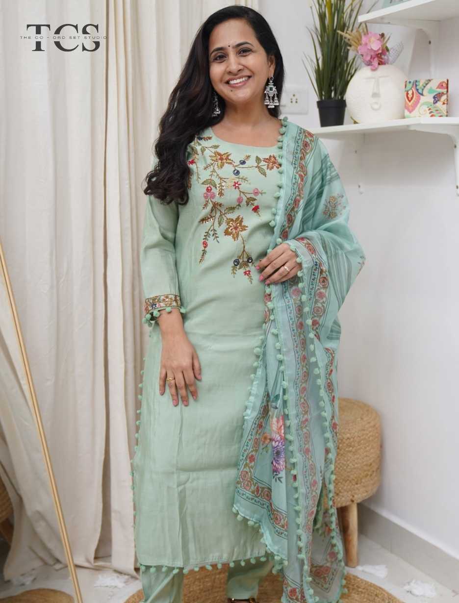 This elegant suit set is crafted in premium dola silk and designed to offer a refined blend of