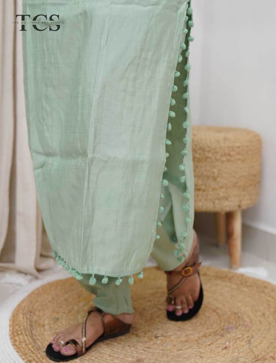 playful pompom detailing along the side slits, adding charm and movement to the design. The