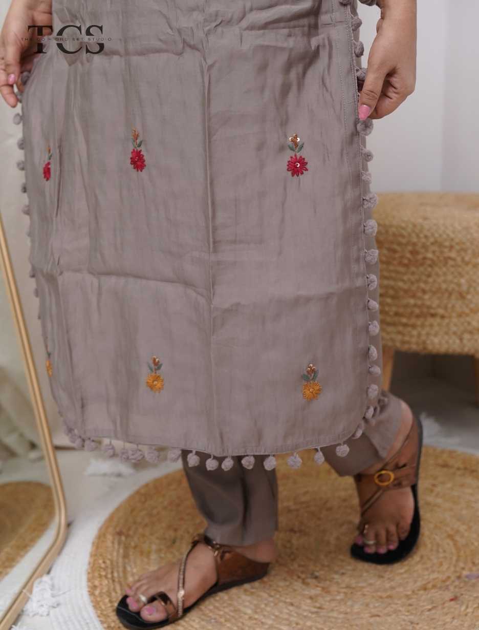 playful pompom detailing along the side slits, bringing a touch of handcrafted elegance. The
