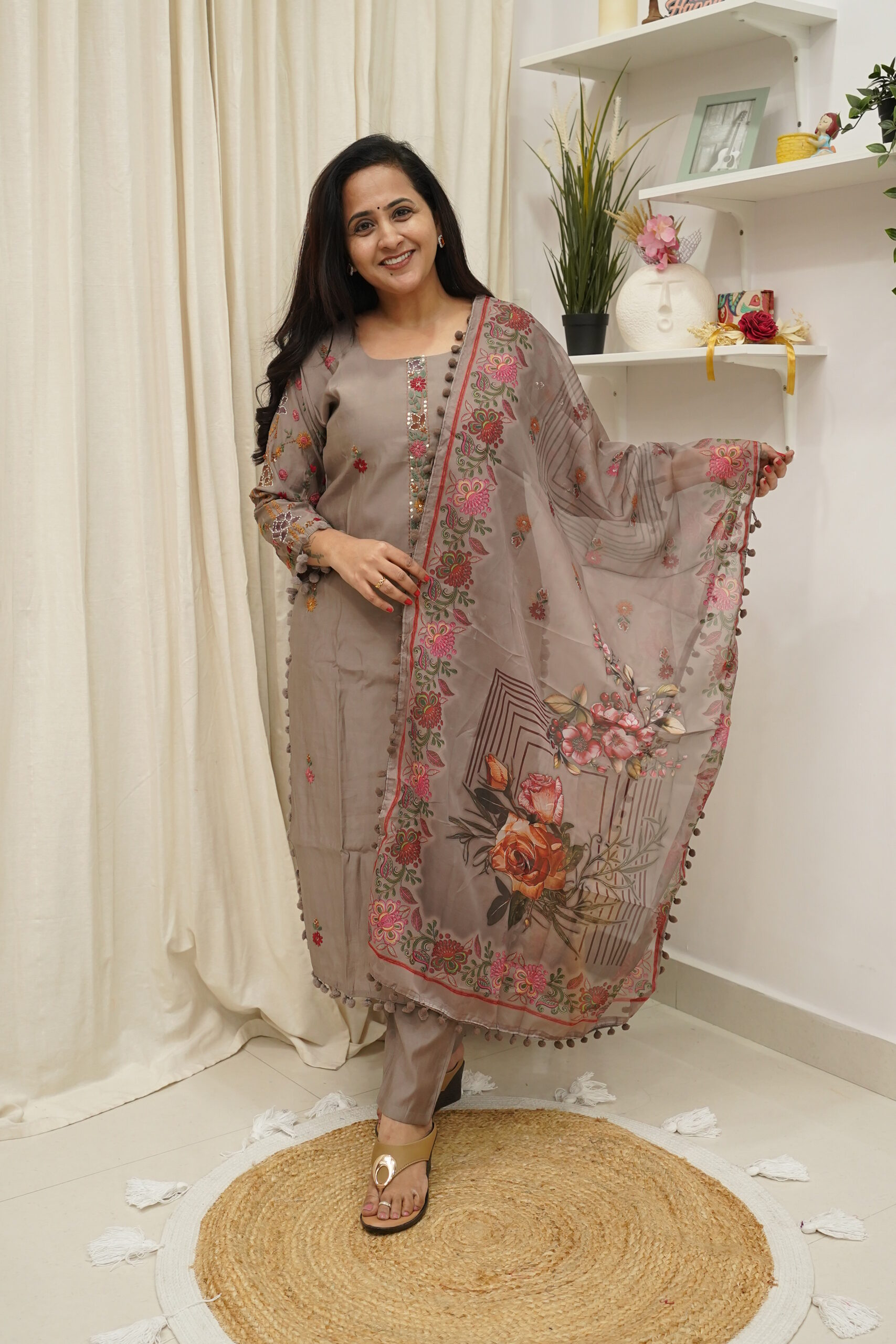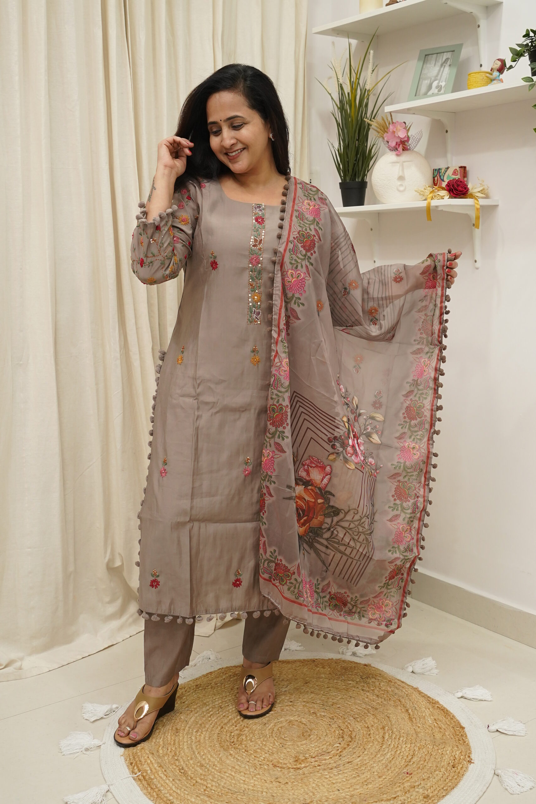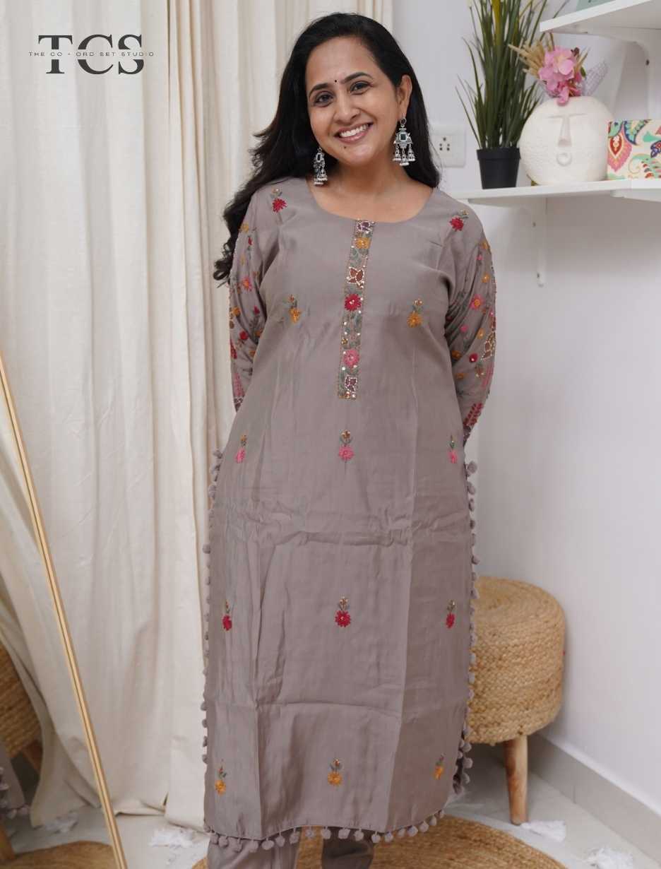 This elegant suit set is crafted in premium dola silk and designed to offer a refined blend of