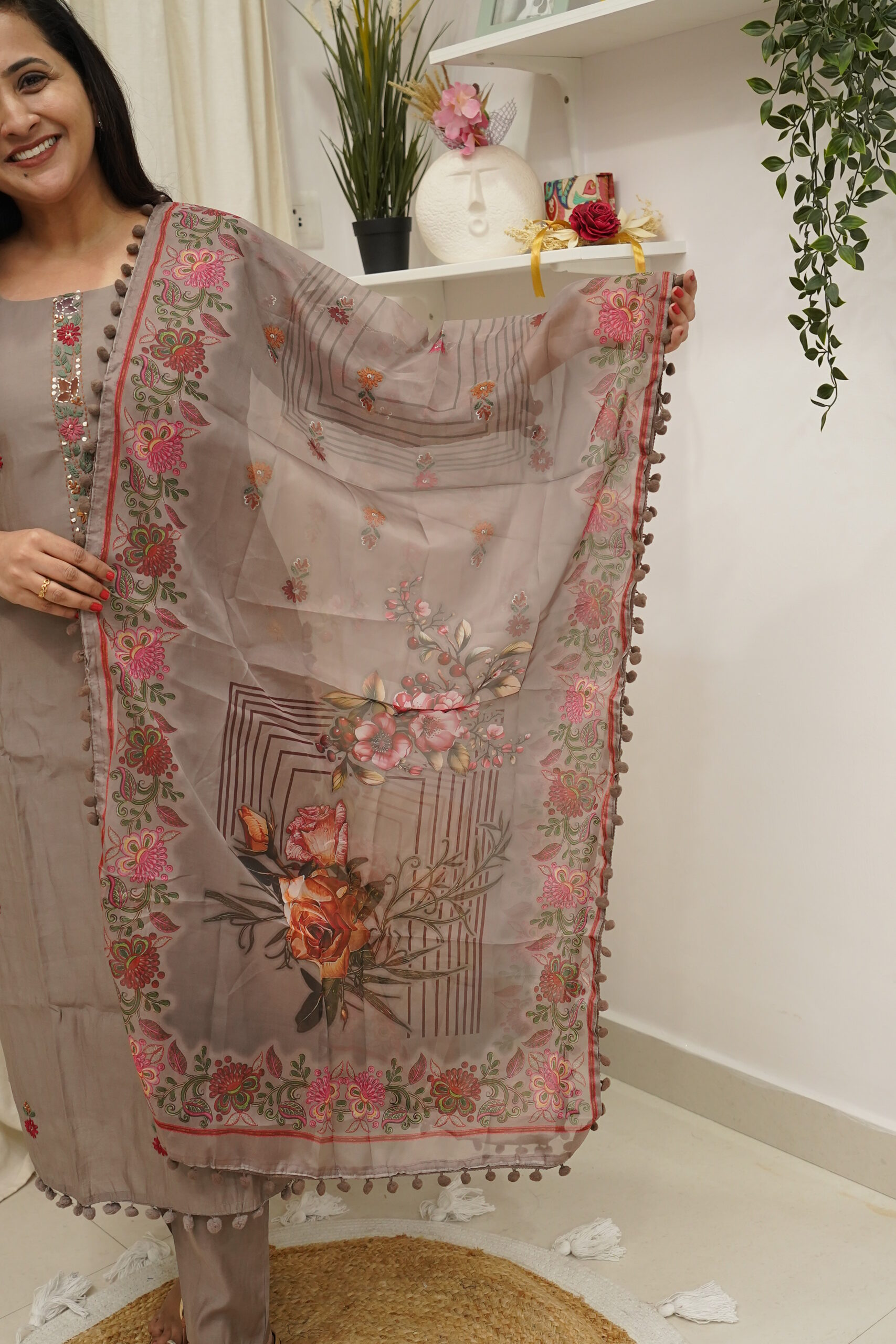Completing the look is a printed soft organza dupatta, highlighted with pompom detailing at the