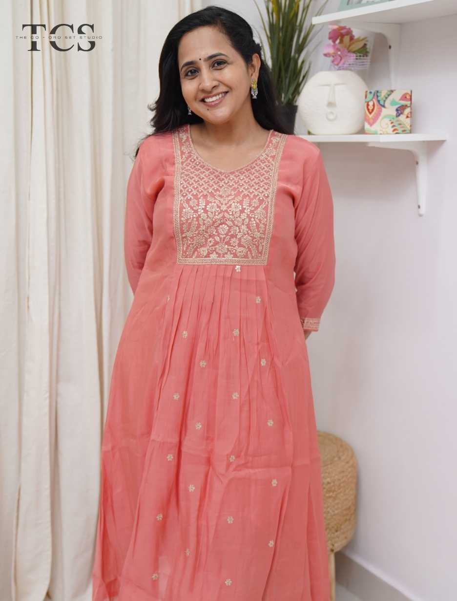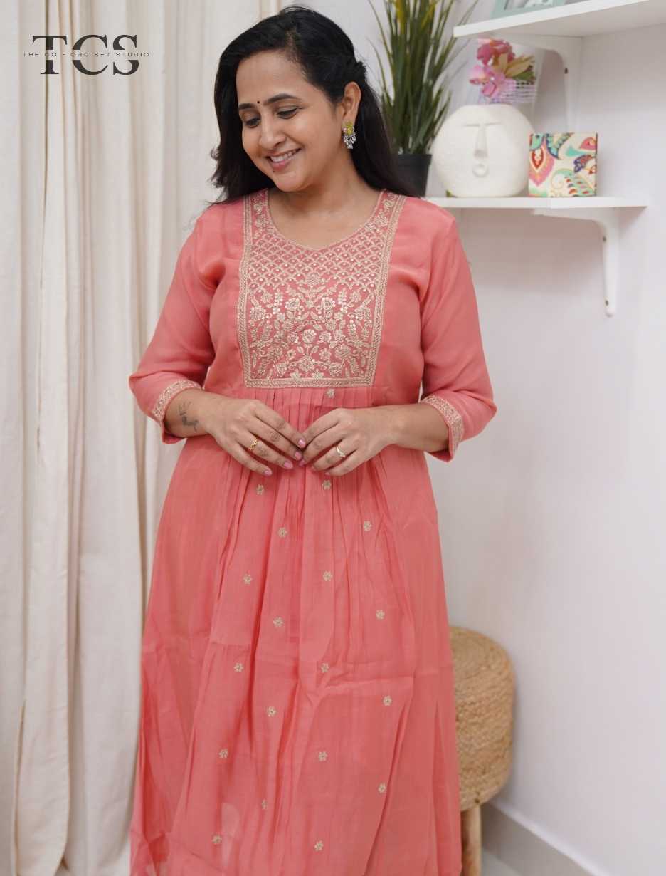The kurti is adorned with intricate embroidery on the yoke, enhanced further with elegant embroidery at the sleeve endings, adding richness and balance to the design. Subtle booties spread all over the kurti bring a touch of traditional charm while maintaining a graceful, minimal aesthetic.