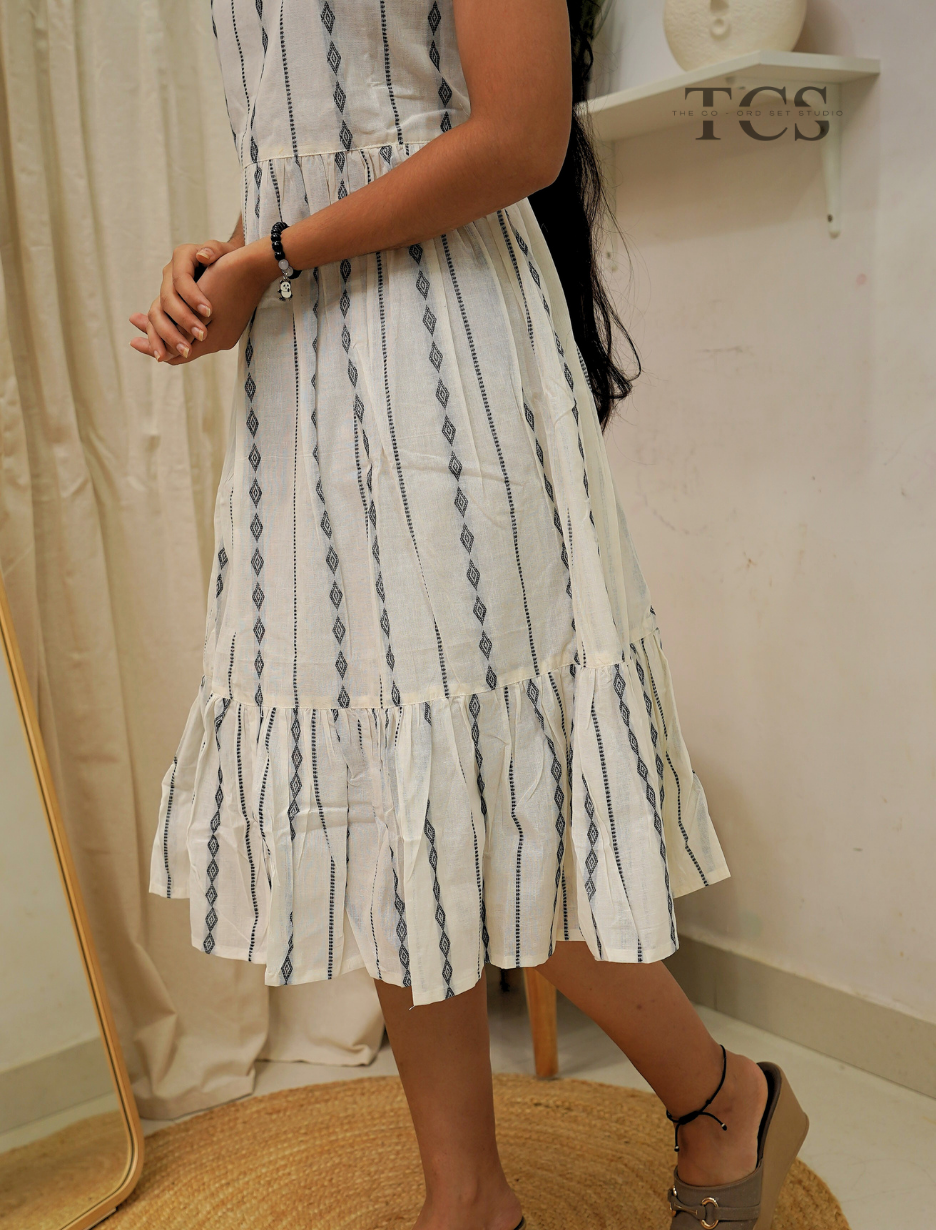 The Stripe Serenity Frock brings classic sophistication with a modern twist. Crafted from airy off-white cotton, the frock features elegant vertical stripes in subtle tones, creating a refined and flattering silhouette. The square neckline, flutter sleeves, and tiered hem give it both poise and movement—making it a perfect pick for easy elegance any day of the week.