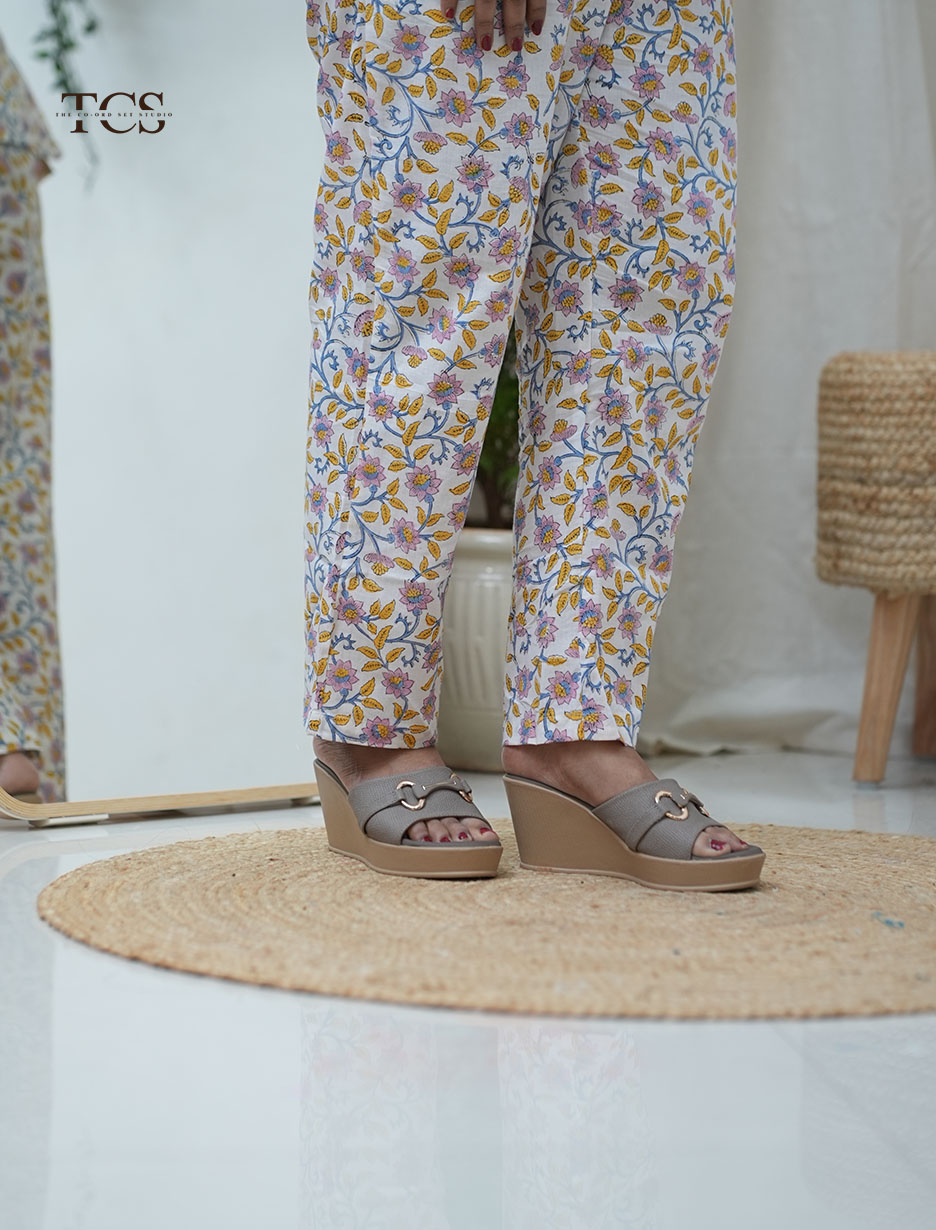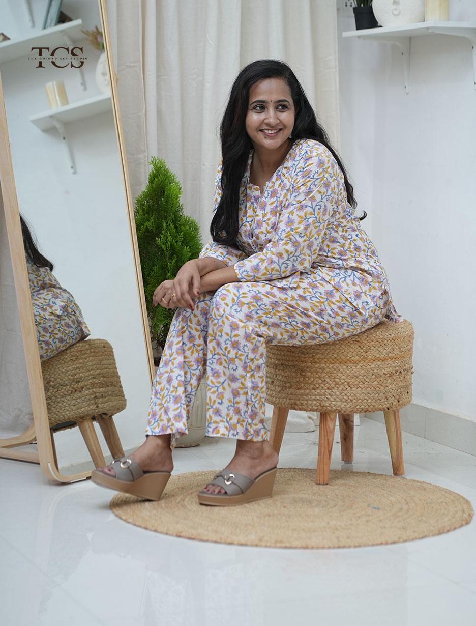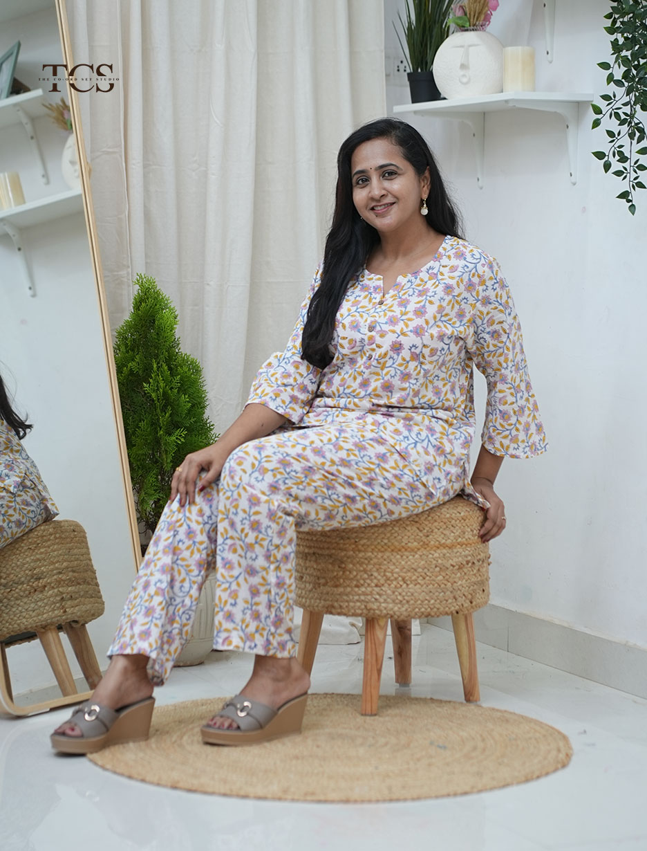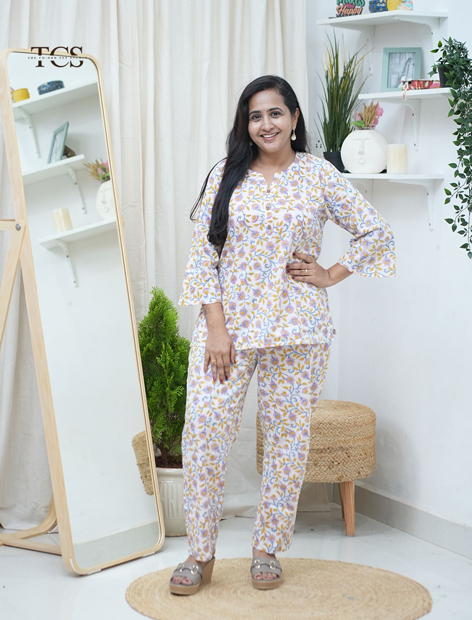 Brighten up your everyday style with this white floral printed co-ord set that blends comfort with cheerful elegance. Ideal for casual outings, lounging, or work-from-home days, this set keeps you looking effortlessly put-together.