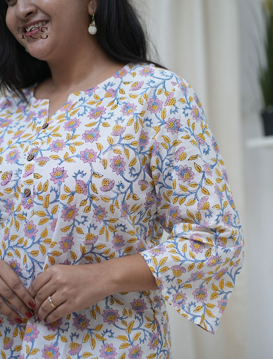 Crafted from soft, breathable cotton fabric with an all-over floral motif in yellow and lavender tones.